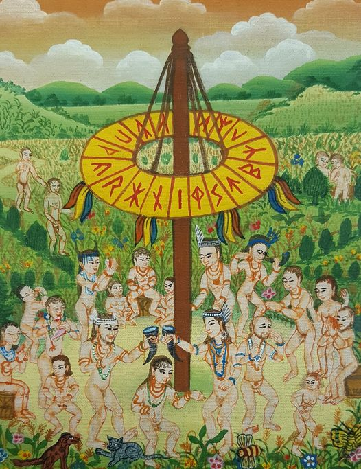 Hugmyndun: Vatni þrúngin ský í fjarska yfir gróðursælum túnum og ökrum, fólk að villtum dansi, djásnum prýtt, kríngum hátíðarstöung eða –súlu, e.t.v. uppskeruhátíðar, etv. miðsumars. Margt menna er með drykkjarhorn í hendi, skálar og drekkur, og sumt þeirra hefur brugðið sér frá um stund, kannski til ásta eða kynmaka, eða kannski bara til að létta á blöðrunni. Krans stángarinnar sem dansað er undir, skartar stöfum rúnatöflu Heimsins rúna, en með því er slegið föstu að þetta sé fögnuður og veisla í heiminum, og ekki með huga til þess sem er handan heims. Dýralífið, litadýrðin og gróðursældin í forgrunni undirstrikar sama hlut. Þetta er veraldleg hátíð, og frí um stundar sakir frá alvöru lífsins.
