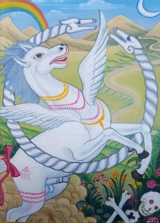 Hugmyndun: Reiðskjóti fljúgandi, merktur Óðni, – ekki átta fótum búinn eins og Sleipnir Eddunnar, heldur fjórum fótum og tveimur flugvænum vængjum, – flýgur í gegnum Eiðshrínginn, og sannar þannig hlut sinn.