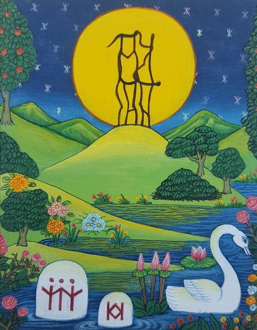 Hugmyndun: Þetta allt á sér stað ofar skýjum, en jörðina, merkur hennar og vötn og búfé, gefur að líta á milli skýjahnoðranna. Þeir hrafnar Óðins, Huginn og Muninn, eru hér saman komnir og athuga vel vettváng allan. Í fjarska má sjá Guðanna Borg, og Álfa og Jötna, en nær okkur skip á siglíngu á einum skýjabakkanna, byrðíngur þess prýddur skjöldum með Mannrúnu á, drekahöfuð stafnsins gefur hýrt auga til þess sem er að gerast á túnglinu, en þar er að sjá tvo svani að kyssast og yfir þeim kórónu merkt Bogrúnunni, til táknunar þess hugarþels sem er aðall þessarar rúnar. Efst á masti er gunnfáni Tri–Ísa |||, Sjálfsins í Æðra Veldi sínu, en á stefni skipsins ristíngarnar IAM og WHU, sem útleggst: ég er hvert?