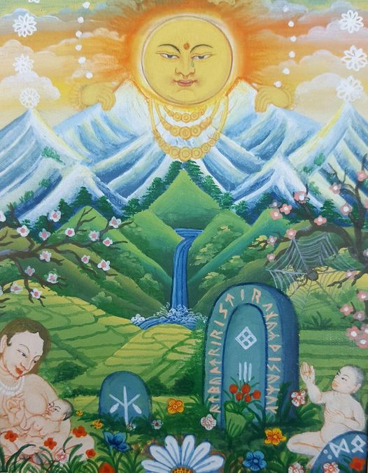 Hugmyndun: Sólin gægist yfir ísi þakta fjallatinda, prýdd Brísíngameni Mardallar (sem ég skil sem geisla sólar), og bræðir ísinn svo úr verður fossandi flóð þegar leíngra niður í dalina er komið. Þetta er vísun til þeirrar hlýju, alúðar og ástúðar sem Sólrúnan normalt býr yfir. Sama er gefið í skyn með koninu* sem í augljósri geðmildi heldur úngabarni í faðmi sér og gefur því brjóst.