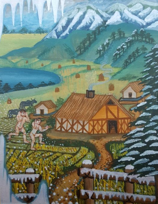 Hagéli skellur á, sumt gróðurs í garðreitunum tekur skaða, og tvö mannveri** hlaupa undan élinu til skjóls, enda nakin og haglið meiðandi. Girðíng, ísi hlaðin, er fyrir bænum, og snjór er í trjám. Heildarmyndin er kuldi, sókn í skjól og fyrirhöfn til lífsafkomu.