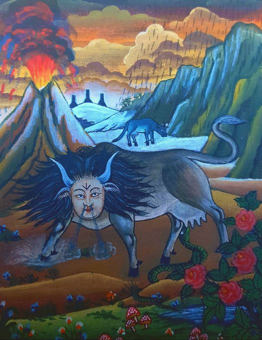 Kýr með manneskjuásýn og mikinn og gróskulegan hárvöxt, blæs nösum, og stappar niður hægri fæti sínum í sandinn, og sýnir með því skapgerð sína, kraft sinn, og heift. Milli augna sinna hefur dýrið rúnu, sem er steypirína Týrs, og samtímis heilrúna af steypirúnu Lagus–Lögrúnunnar, en sá stinni stafur er algjör andstæða Urusazrúnunnar í hugheimum.