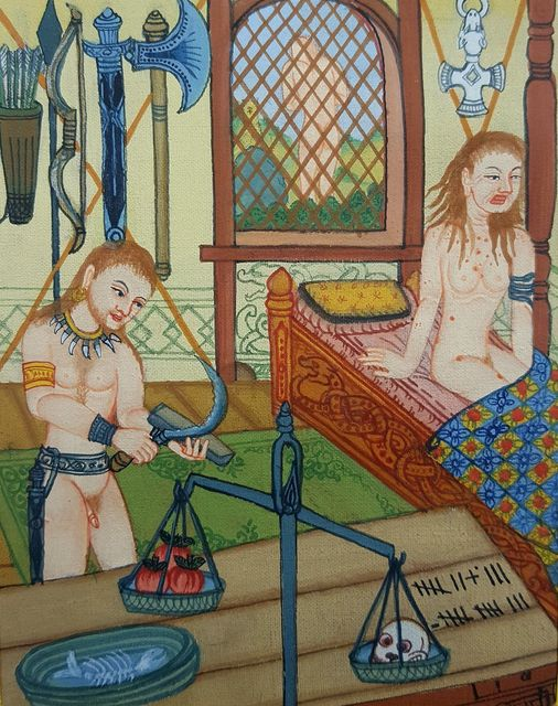 Til hliðar á veggnum hánga verkfæri, en það eru vopn ýmiskonar íbúum til varna. Að matborði í herberginu stendur stríðsmenni eitt, vopnum búið, og er það hér að brýna sigði sitt til uppskeru nauðþurftanna. Í fati á borðinu fyrir framan það, beinagrind uppetins fisks, en útreikníngar hafa verið gerðir í eina fjala borðsins. Í forgrunni næst þér, gefur að líta vog, og í annarri skál hennar ávexti, í hinni höfuðkúpu, og vegur sú síðarnefna greinilega meira.