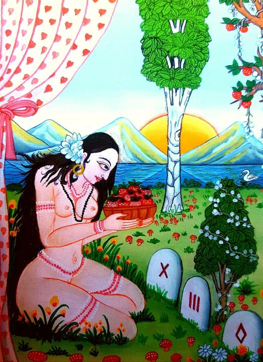 Mikla gróðursæld og frjósemd er að finna á þessum stað, blóm og ávexti, nytjajurtir, en allt er þó ekki gott og vel: váteikn eru á lofti, sól er særð, örn flýgur yfir með orm í greipum sér, íkorni, Rátatosk, rennur upp, og sjálfsagt niður líka, Heimstréð, Ask Yggdrasils, sem hér er að sjá í tveimur myndum, sem úngt og blómstrandi annarsvegar, og sem aldrað, hækjum stutt og spjölkum hinsvegar, en sem þó ennþá frjótt og gjöfult. Perlur eru hér til fegrunar því aldna.
