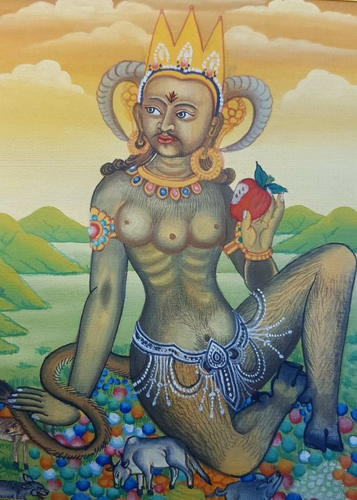Táknmál þessarrar hugmyndunar er augljóst: Hornin, halinn, og klaufarnar upplýsa um að hér sé á ferðinni ómenni eitthvert, hvort heldur það nú ekki enn hafi náð mannveruþroska, eða þá hefur orðið fyrir firríngu sjálfs sín af eigin völdum, og þar með firríngu frá öllu því sem manneskjulegt er. Eplið seígir að hér sé sælst í allt gott sem í heiminum er. Túnið, sælgætið og búféð tala um eignarhald, fýsnir og ásælni almennt. Og að þetta ómenni, hálfguð eða þurs hafi einu brjósti of mikið, þýðir einfaldlega alltof mikill veraldlegur losti, og bókstaflega takmarkalaus græðgi.