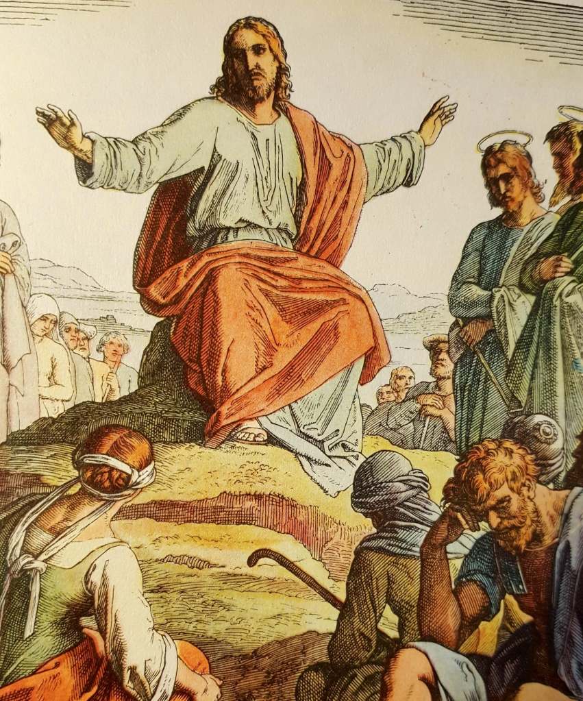 (1) Þá er Jesús sá fólksfjöldann gekk hann upp á fjallið og settist þar niður. Lærisveini hans komu þar til þans, (2) og hann hóf að kenna þeim og sagði: (3) Sæli eru fátæki í anda, því að þeirra er himnaríki. (4) Sæli eru syrgjendi, því að þey munu huggaði verða. (5) Sæli eru hógværi, því að þey munu jörðina erfa. (6) Sæli eru þey sem hungrar og þyrstir eftir réttlætinu, því að þey munu saddi verða. (7) Sæli eru miskunnsami, því að þeim mun misskunnað verða. (8) Sæli eru hjartahreini, því að þey munu Guð sjá. (9) Sæli eru friðflytjendi, því að þey munu Guðs börn kallaði verða. (10) Sæli eru þey sem ofsótti eru fyrir réttlætis sakir, því að þeirra er himnaríki.